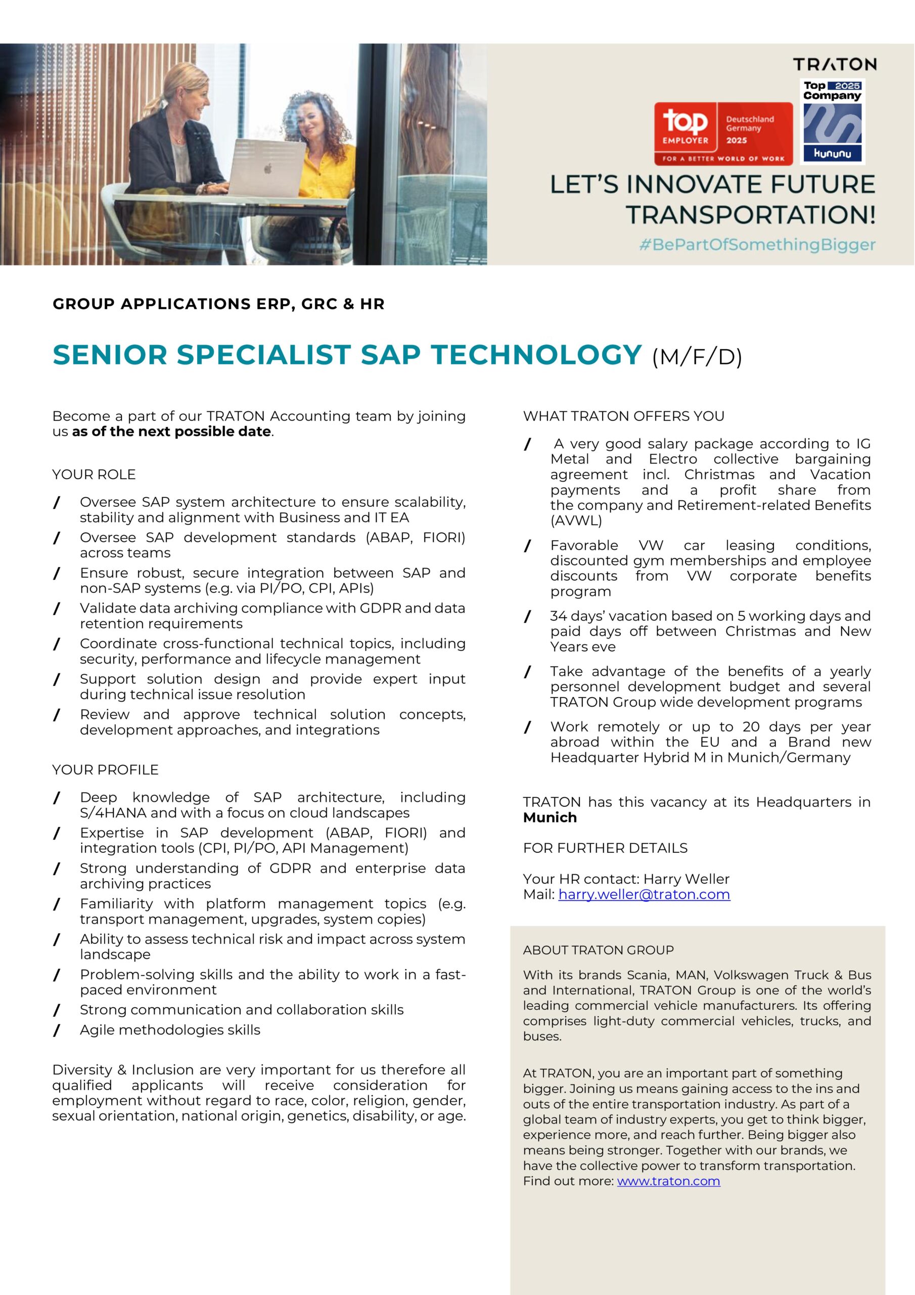 With its brands Scania, MAN, International and Volkswagen Truck & Bus, TRATON SE is one of the world's leading manufacturers of commercial vehicles. The Group's portfolio consists of trucks, buses and light commercial vehicles. In addition, TRATON SE offers its customers a wide range of financial services.