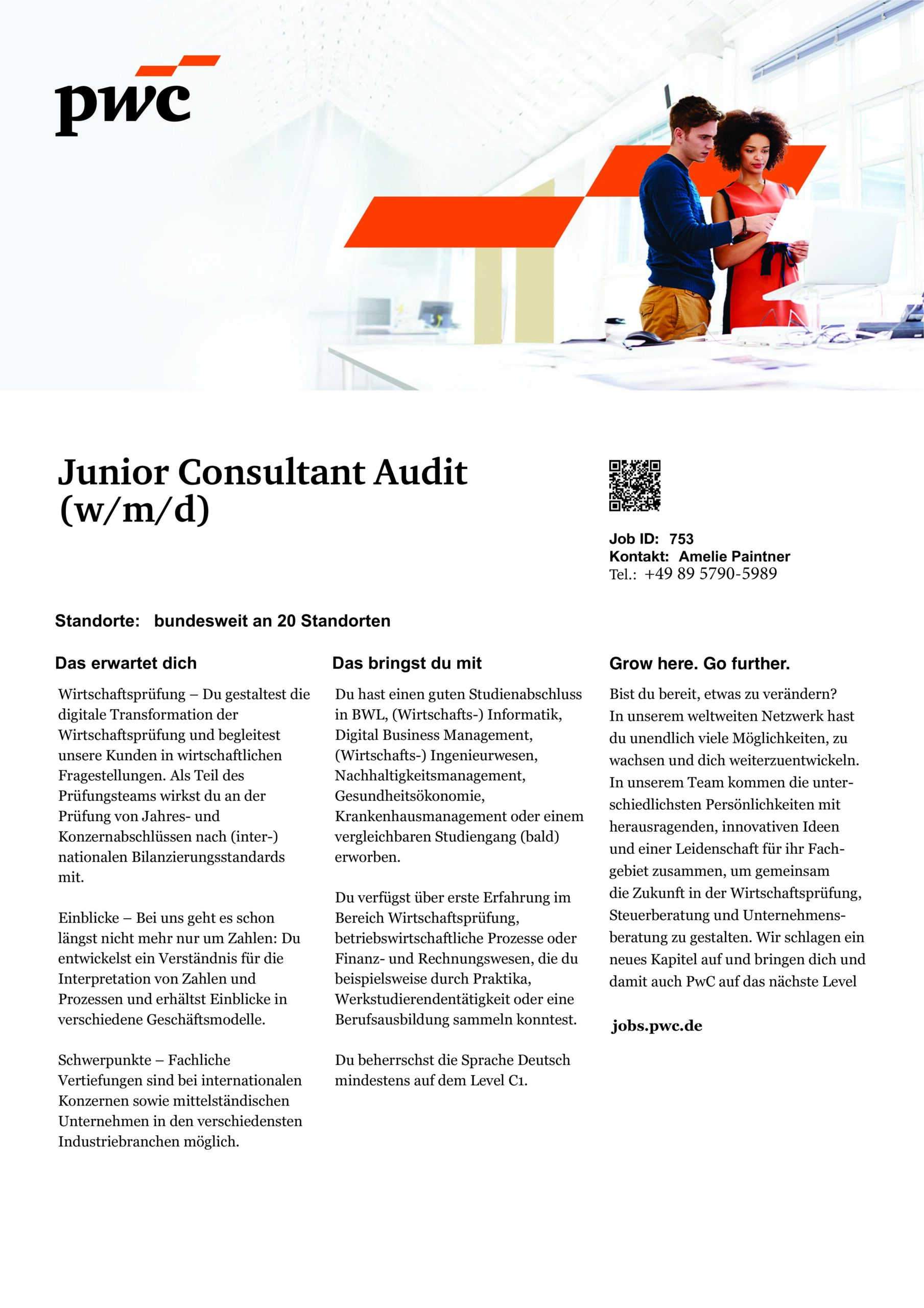 Du bist Analyst:in, Betriebswirt:in, ITSpezialist:in, Wirtschaftsprüfer:in, Innovationstreiber:in? Lass dich überraschen wie viele unterschiedliche Personen bei PwC Deutschland zusammenkommen, um gemeinsam daran zu arbeiten mit Einfallsreichtum, Erfahrung und technologischer Innovation entscheidende Herausforderungen zu lösen, nachhaltige Ergebnisse zu schaffen und das Vertrauen in unsere Gesellschaft auszubauen.