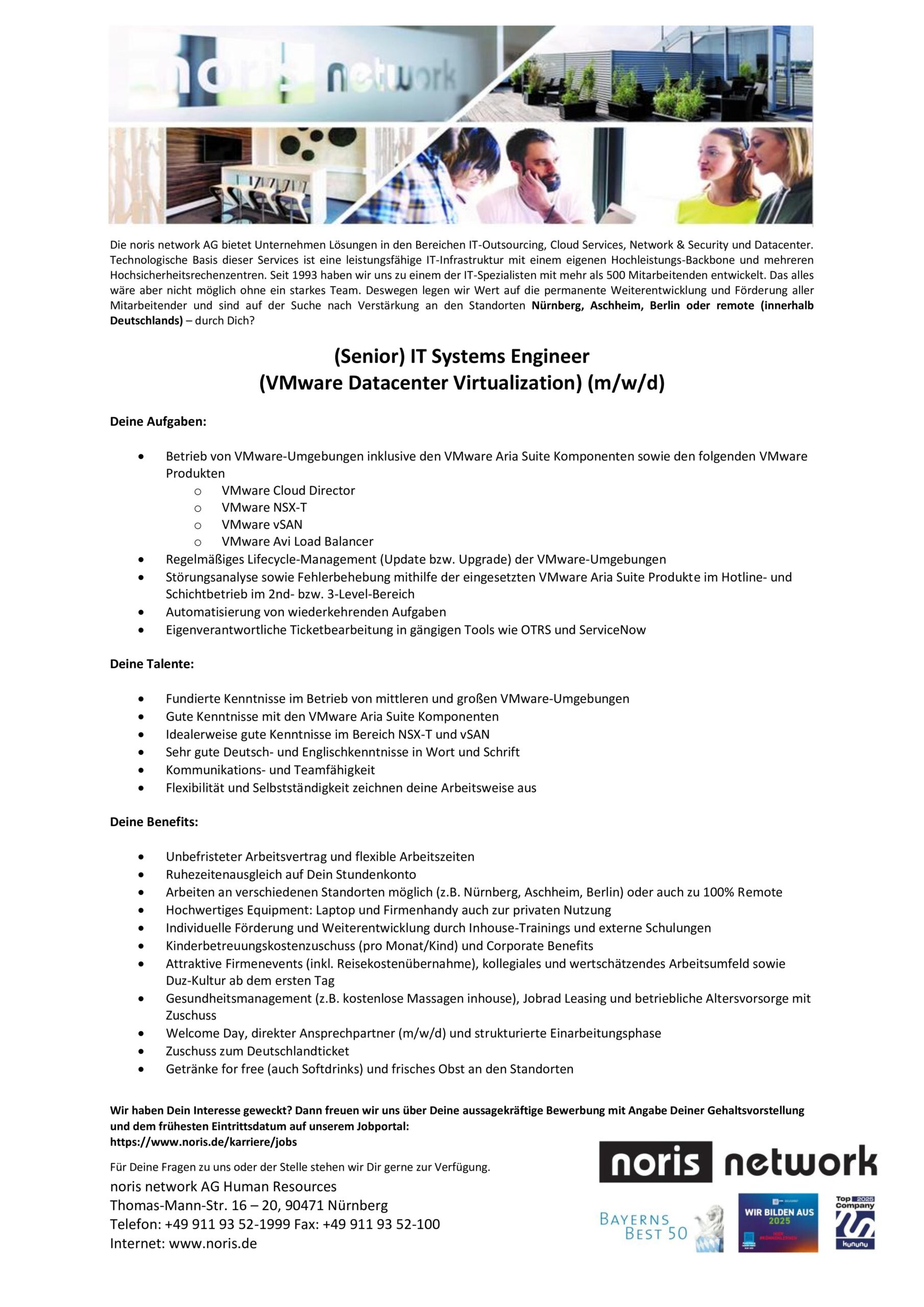 Bei der noris network AG brennt unser Herz für IT, die mehr kann: smarter, nachhaltiger und absolut verlässlich unseren Kunden gegenüber. Über 600 Mitarbeitende arbeiten bei uns jeden Tag daran, leistungsstarke Services in den Bereichen Cloud, Datacenter, Network & Security sowie Managed Applications zu realisieren – betrieben auf einer hochmodernen, mehrfach zertifizierten IT-Infrastruktur mit eigenen Hochsicherheitsrechenzentren.