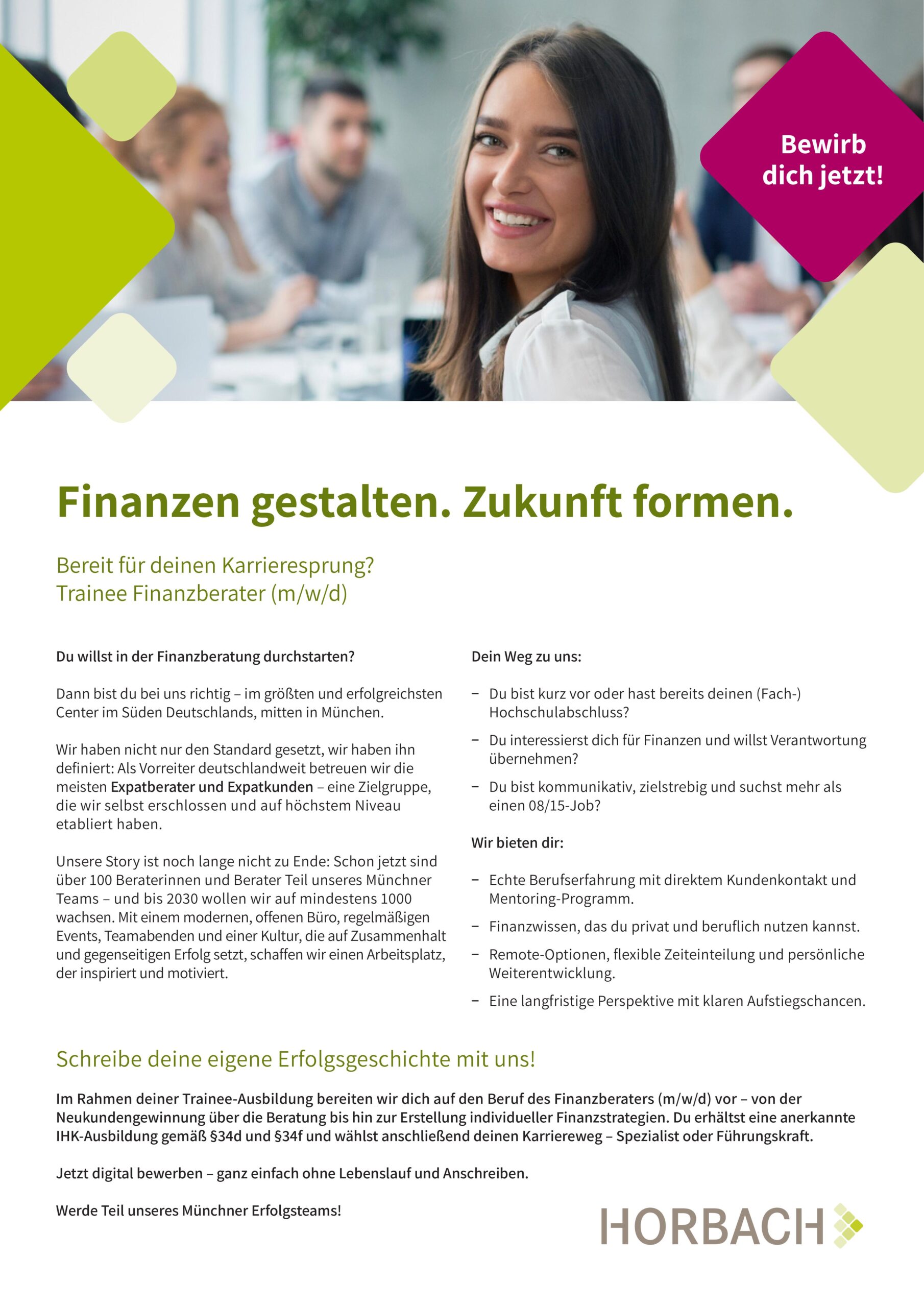 Wer wir sind Seit 1983 entwickelt HORBACH für Akademikerinnen und Akademiker Finanzlösungen nach Maß. Dazu stellen wir die Träume und Pläne unserer Kundinnen und Kunden in den Mittelpunkt. Produkte, Services, Leistungen Unsere Leistungen reichen von ganzheitlichem Vorsorge- und Vermögensmanagement über Existenzgründungsberatung für Heilberufe bis zur betrieblichen Altersversorgung. Wir beraten umfassend. Und ein Leben lang. Und gehen dabei immer auf die individuellen Wünsche und Vorhaben unserer Kundinnen und Kunden ein. Unsere lizensierten Finanzberaterinnen und -berater schöpfen aus einer umfangreichen Produktvielfalt und verlassen sich dabei auf aktuell über 250 Produktpartner. So erarbeiten sie individuelle Finanzpläne – die Grundlage für finanziellen Schutz und wirtschaftliche Freiheit.