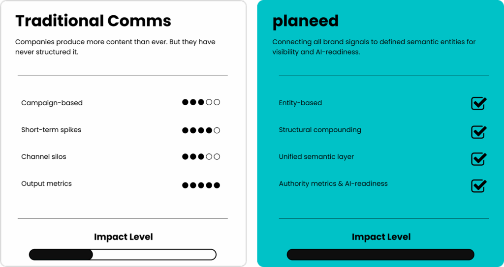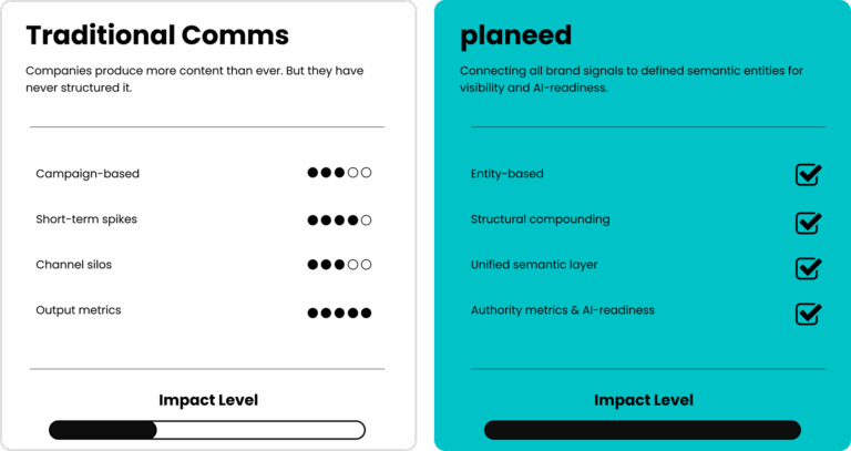 planeed structures your communication around strategic entities — turning content, channels and campaigns into measurable authority and AI-ready brand data.